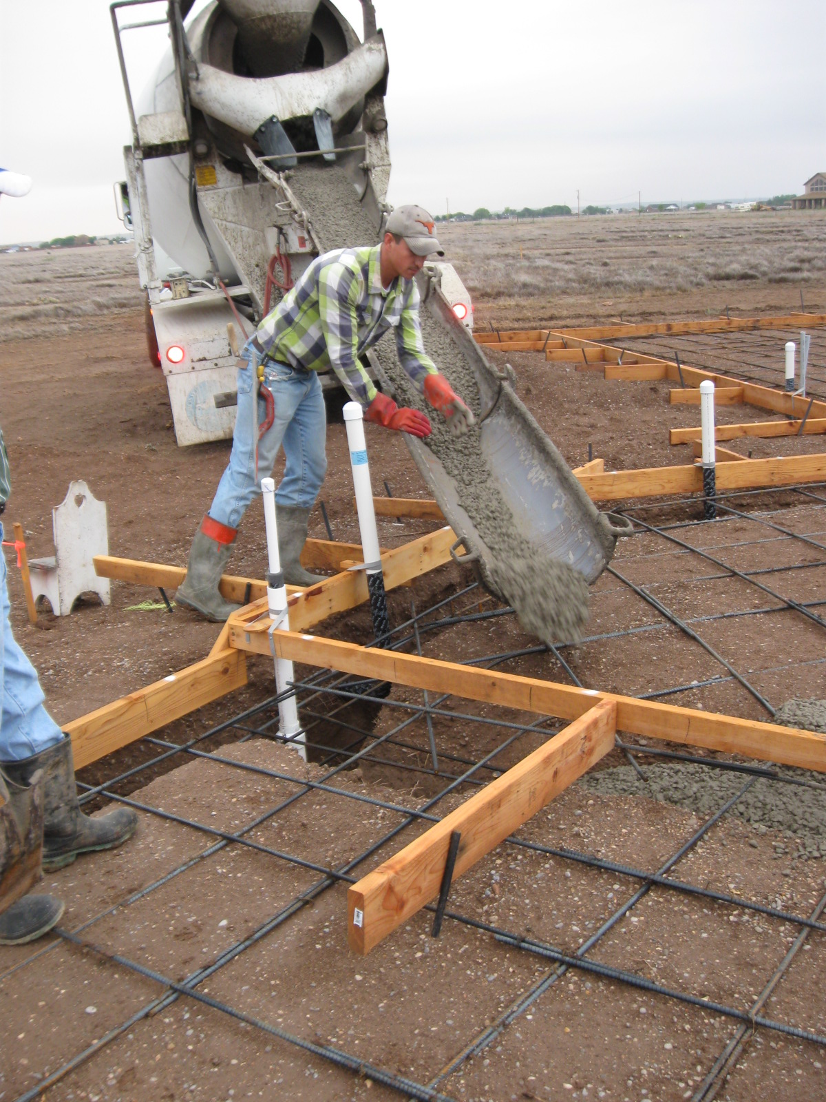 After several weeks’ worth of preparation (I had no idea there was so much involved before we did this ourselves), the foundation pour happened! Two nights before the pour (Sunday evening), we got a wonderful heavy rainfall. We were concerned at first that it might do damage to the trenches, but all was well. Our concerns over the muddy road were also unfounded.